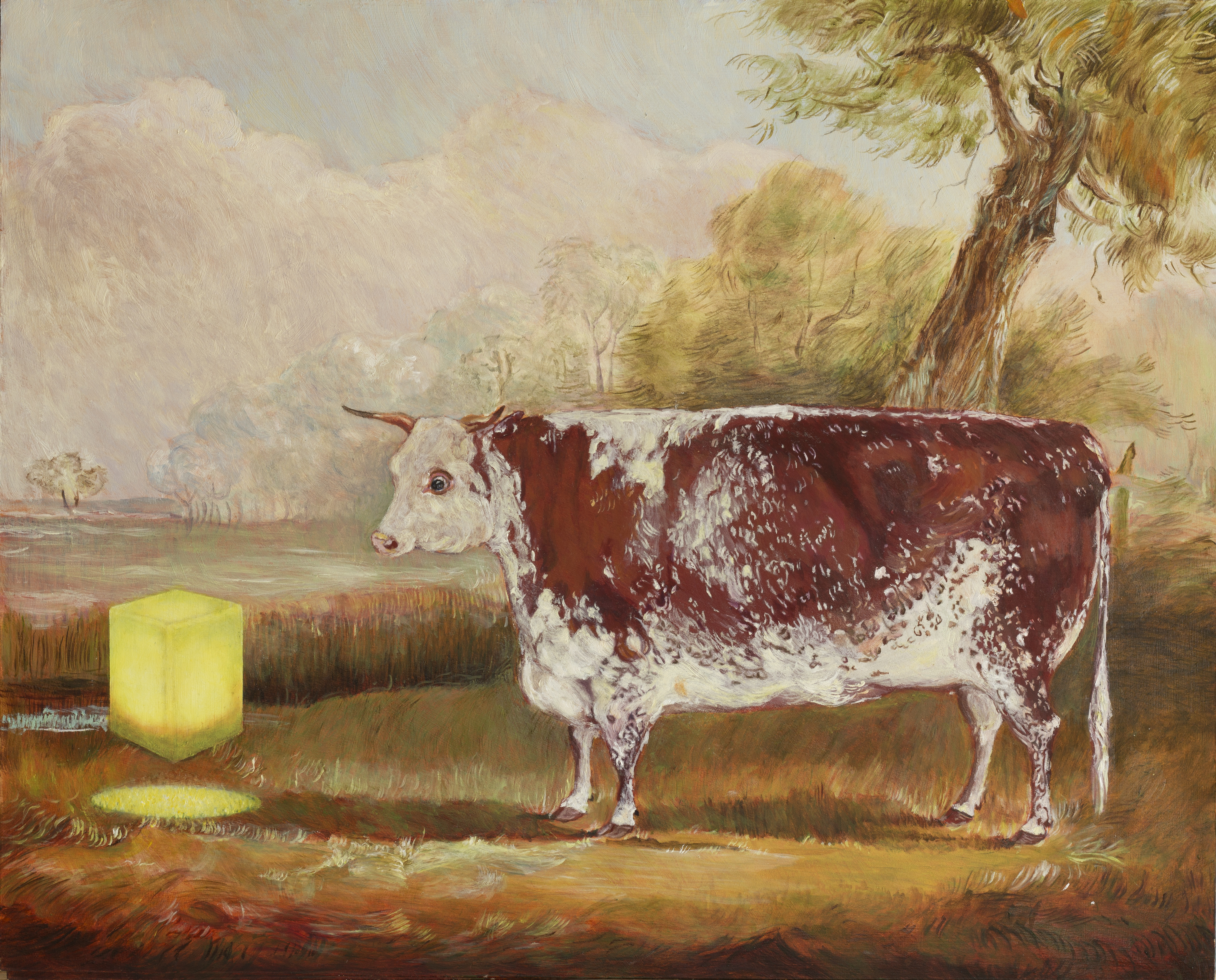 19th century bull in landscape with glowing yellow cube intervention. Oil painting